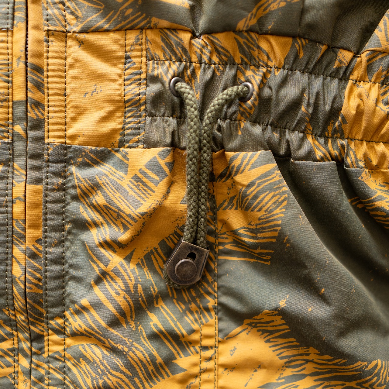 落ち着いたオレンジと緑のカモ柄が特徴的なスノージャケット。
